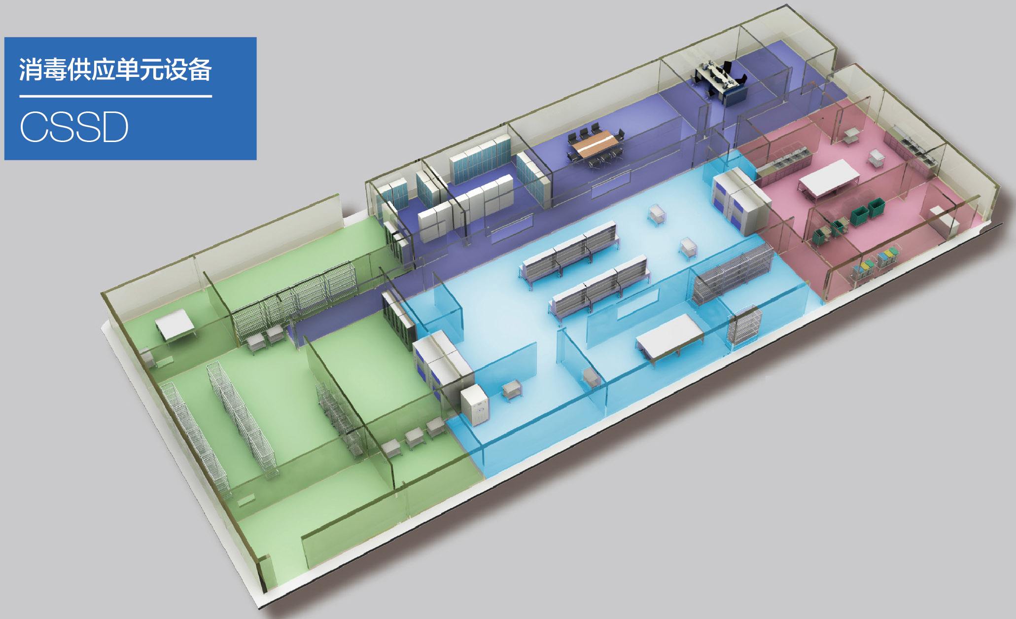 設(shè)有接受、分類、浸泡、洗滌、超聲波清洗機(jī)、敷料打包、器械打包、消毒、無(wú)菌儲(chǔ)存、發(fā)放。