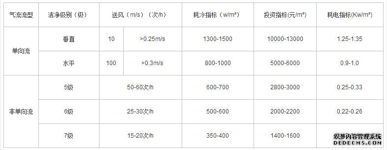 注:表中的送風量、單向流以斷面風速表演示,非單向流以換氣次數表示。